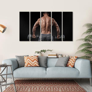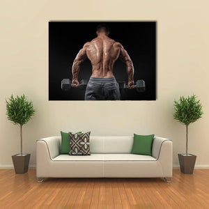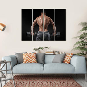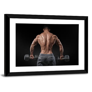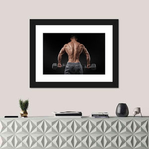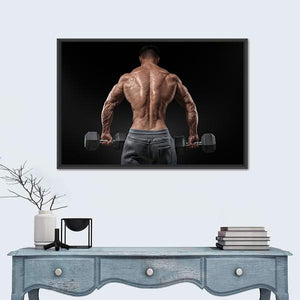 This canvas art portrays a muscular male bodybuilder in an intense pose, showcasing detailed back muscles as he holds weights. With a powerful palette of brown, grey, and black, it captures the essence of strength and fitness, making it an ideal statement piece for a workout space or gym.
