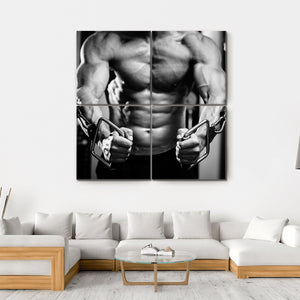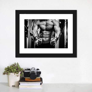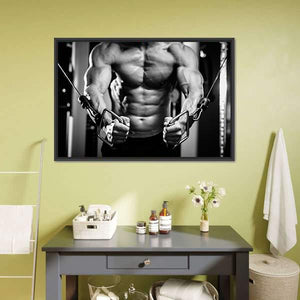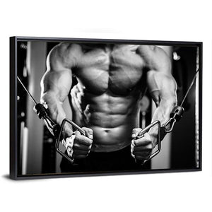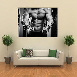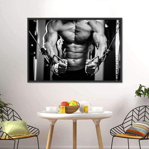 This canvas wall art features a close-up of a powerful bodybuilder in a gym setting, showcasing detailed muscle definition and weightlifting equipment. The intense mood captures the determination and strength associated with fitness and athleticism.