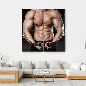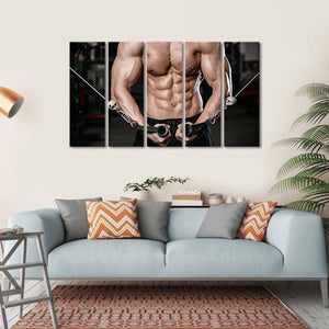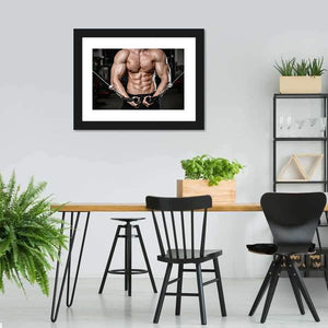 This dynamic canvas features a bodybuilder captured in the midst of a chest exercise, showcasing defined abs and muscles. The dark background enhances the powerful and focused atmosphere, making it an inspiring piece for any fitness enthusiast.
