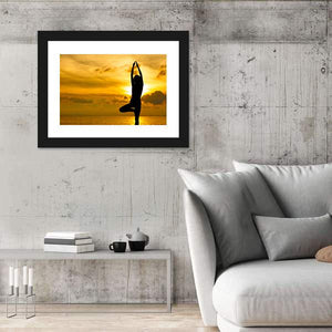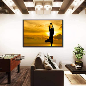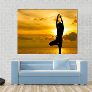 This canvas art features the serene silhouette of a woman in a yoga pose against a dramatic sunset sky. The calming orange, gold, and black palette evokes peace and tranquility, perfect for creating a tranquil atmosphere in any room.