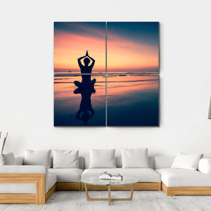 This serene canvas art features a silhouette of a woman meditating against a tranquil seaside sunset. The calming palette of blue, orange, and pink invites a peaceful atmosphere, making it a lovely addition to your wall decor.