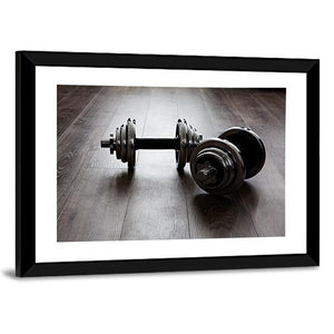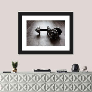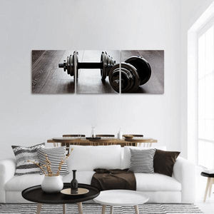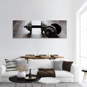 Two black dumbbells sit centered and symmetrical on a panoramic canvas print, creating a strong, powerful, focused mood. The minimalist, modern, industrial look fits home gyms, workout rooms, and contemporary interiors that favor clean, focused decor.