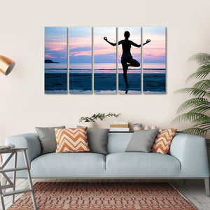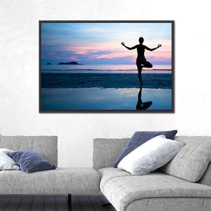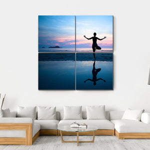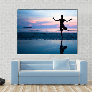 This tranquil canvas art captures the serene moment of a woman practicing yoga on the beach during sunset. The silhouette in a tree pose reflects beautifully on the wet sand, surrounded by soothing shades of blue, pink, and orange that evoke peace and calm.