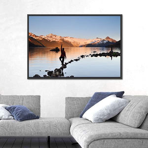 A lone yoga figure stands silhouetted on rocky shores at Garibaldi Lake, framed by snow-capped mountains and calm water. The sunset tones of blue, orange, white and brown give the scene a peaceful, adventurous, and serene feel. This modern landscape print works well in a yoga space or contemporary living room.