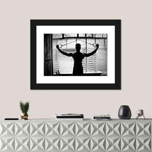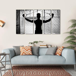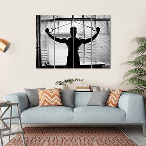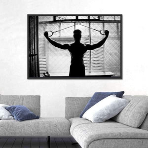 This canvas wall art features the silhouette of a muscular man training with gym equipment, evoking strength, focus, and determination. The modern, minimalist design in black, white, and grey works beautifully in fitness spaces or contemporary home gyms.