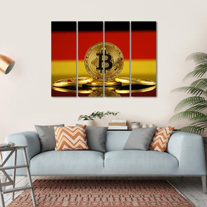 This canvas art features a striking close-up of bitcoin coins against the backdrop of the German flag. The bold colors of gold, red, yellow, and black evoke a sense of financial strength and patriotism, making it a perfect addition for modern spaces.