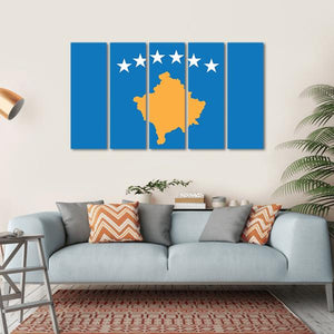 This canvas wall art features the flag of Kosovo, showcasing six white stars above an orange map outline. Its bold blue, orange, and white palette evokes a patriotic mood, making it a striking addition to any space.