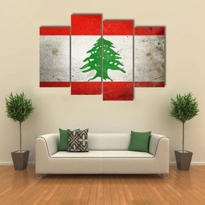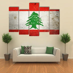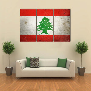 A graphic, vintage take on the Lebanese flag, featuring the iconic cedar tree set against distressed red and white bands. The symmetrical composition and grunge texture bring a patriotic, iconic mood that fits house and room decor with a modern or vintage sensibility.