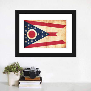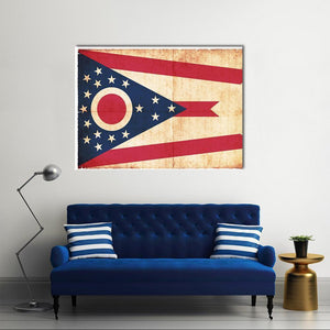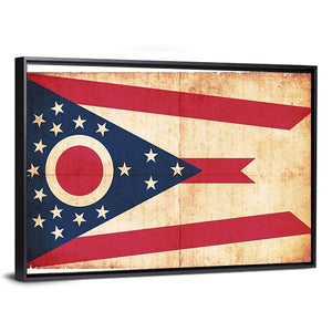 This canvas features the Ohio flag with a vintage, distressed look that highlights worn edges, stars, chevrons and stripes. Its patriotic red, white, blue and tan palette creates a classic, textured mood that pairs well with modern or vintage home décor.