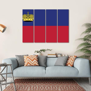 This striking canvas art features the Liechtenstein flag, complete with its regal crown. The design highlights a formal, symmetrical composition, blending blue, red, and gold hues to create an eye-catching display.