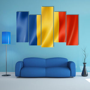 A modern, abstract take on the Romania flag, this canvas shows the flag’s blue, yellow and red in a symmetrical, vibrant composition that suggests the motion of waving fabric. Its patriotic energy works well with house and room decor as a colorful focal piece.