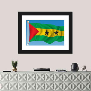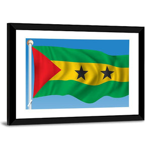 Celebrate the vibrant flag of Sao Tome and Principe with this striking canvas wall art. Featuring a bold palette of green, yellow, and red, along with two black stars and a waving flag design, this piece adds a lively graphic touch to your decor.