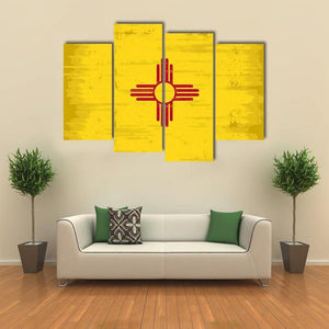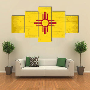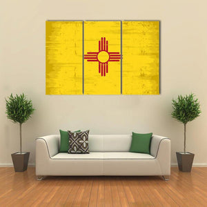State Of New Mexico Flag Canvas Wall Art centers on the state's sun symbol, presented in a bold, iconic graphic style. Symmetry, a yellow-and-red palette and a distressed texture give this abstract, modern piece a strong visual presence. Suited to modern house or room decor that favors graphic statement pieces.