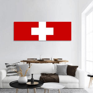 This panoramic canvas features the Switzerland flag with the white cross centered on a bold red field, shown in a clean, minimalist graphic style. Its modern, patriotic mood suits contemporary or minimalist interiors and works well in living rooms, offices, or shared spaces that favor simple, graphic decor.