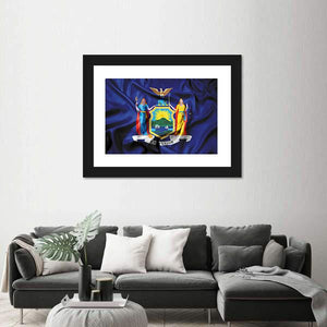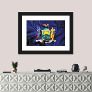 This canvas shows the New York State flag with its coat of arms and the Latin motto 'Excelsior', rendered in blue, gold, green, red, and white. The symmetrical, traditional composition gives a patriotic, regal presence that suits house and room decor.