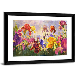 This vibrant canvas art features a close-up of irises, showcasing a lively palette of purple, yellow, red, blue, and green. The impressionistic style and textured brushstrokes bring a cheerful touch to any space.