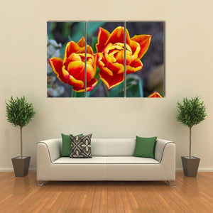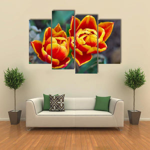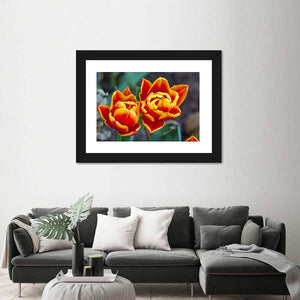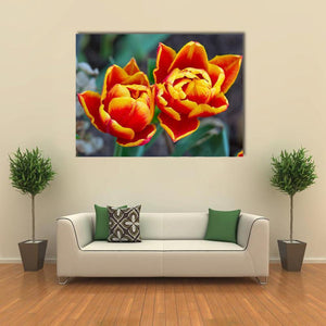 Red Tulips Close-Up Canvas Wall Art features two open tulips with red petals and yellow centers set against a softly blurred green background. The close-up view and warm palette of red, orange, yellow and green give the image a vibrant, natural, cheerful feel. It suits modern house room decor such as living rooms, bedrooms, or entryways.