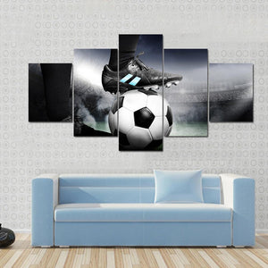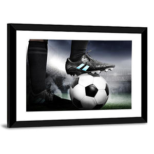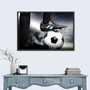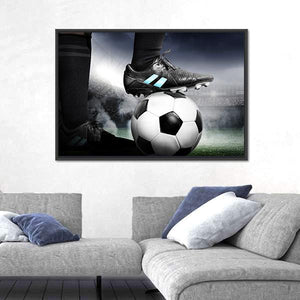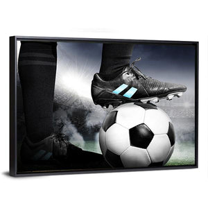 Capture the intensity of soccer with this striking canvas art featuring a player's foot resting on a soccer ball against a vibrant stadium backdrop. The dynamic composition showcases the energy of the game in a bold palette of black, white, and green, perfect for any sports enthusiast.