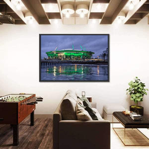 This striking cityscape captures Krestovsky Island at night, showcasing a vibrant stadium bathed in green light. The cool blues and reflections on the water surface create a dramatic, nocturnal atmosphere.