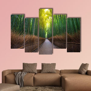 Bamboo forest and a quiet path are at the heart of this Japan canvas wall art, shown in a nature photography style. A vanishing point perspective and clear leading lines—fencing along the path and sunlight filtering through the trees—draw the eye through layers of green, brown, and soft yellow. The calming, peaceful scene works well in modern or nature-inspired rooms as a serene focal piece.