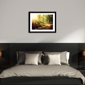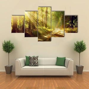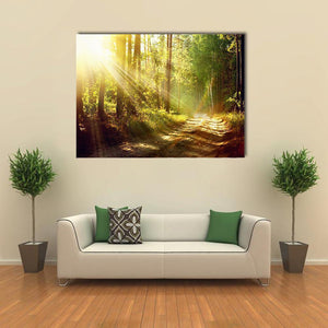 This canvas art captures a serene forest path illuminated by sunlight. Rich greens and soft browns create a tranquil atmosphere, inviting nature indoors.