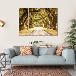 Dirt Road Forest Canvas Wall Art features a tree tunnel heavy with Spanish moss and a dirt road stretching into the distance. Strong leading lines and a symmetrical composition create a serene, atmospheric, natural scene in greens, browns, yellow, and grey. It pairs well with nature-focused or rustic room decor and modern nature interiors.