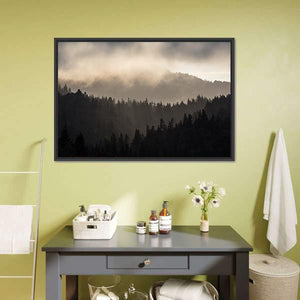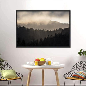 This captivating canvas art features a serene forest scene set against misty mountains, evoking a sense of mystery and tranquility. The dark green, gray, and tan palette enhances the atmospheric mood, making it a perfect addition to modern décor.