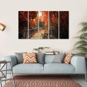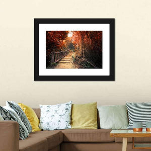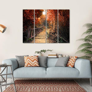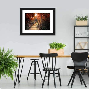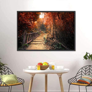 Capture the serene beauty of an autumn forest with this canvas wall art. Depicting a quiet forest path framed by wooden railings and dappled sunlight, it evokes a mysterious charm that enhances any living space. The warm palette of reds, oranges, and browns makes it a perfect fit for nature lovers.