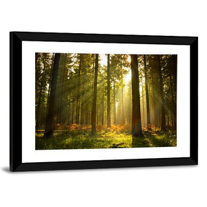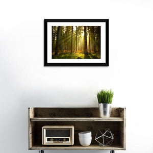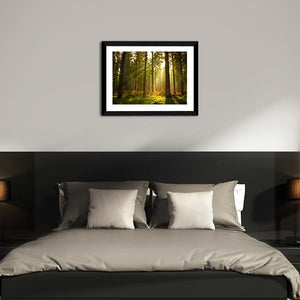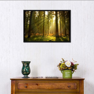 This peaceful canvas features a serene forest illuminated by sunbeams breaking through the trees. The rich green and golden hues evoke a natural, ethereal vibe, bringing tranquility to your space.