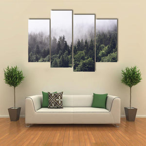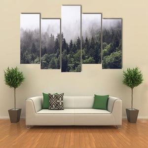 This landscape canvas captures the serene beauty of a dense evergreen forest shrouded in mist. With its atmospheric perspective and tranquil palette of greens and grays, it brings a touch of nature to your space.