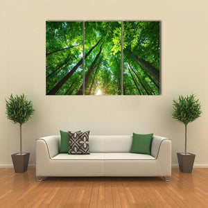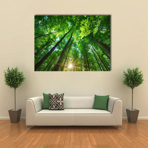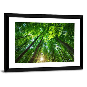 This canvas art captures a serene worm's-eye view of tall trees bathed in sunlight. The rich greens and browns, accented by sun rays filtering through the leaves, create a peaceful atmosphere perfect for any nature lover.