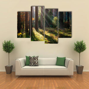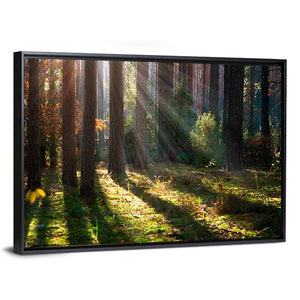 Bring the peaceful essence of nature into your space with the Old Autumn Forest Canvas Wall Art. This realistic depiction of a serene forest features sunlight filtering through the trees, showcasing a calming palette of green, brown, gold, and yellow.