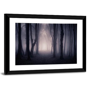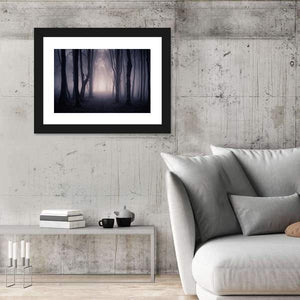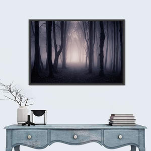 This canvas art depicts a misty forest path lined with bare trees, evoking a mysterious and somber atmosphere. The interplay of dark grays and browns creates a gothic vibe, making it an intriguing addition to any space.