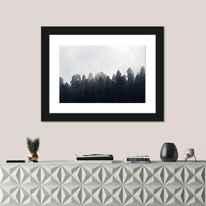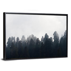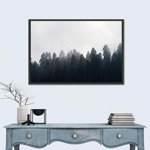 This striking canvas art captures the silhouette of tall trees in a misty California forest. The atmospheric blend of dark greens, grays, and whites creates a serene and mysterious scene, perfect for adding a touch of nature to your wall decor.
