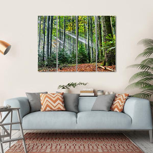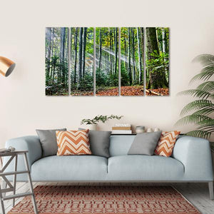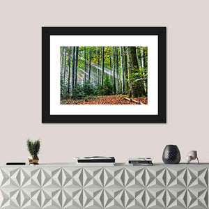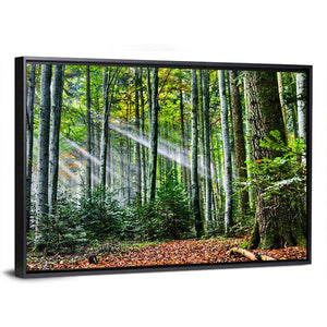 This serene canvas captures the beauty of sunlight filtering through a tranquil forest, featuring lush green trees and fallen leaves. With its ethereal quality, it's a perfect choice for nature lovers looking to add a peaceful touch to their decor.
