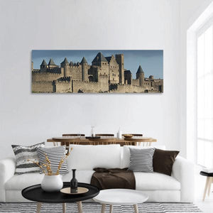 Carcassonne Fortress, France is captured in a panoramic canvas print that highlights the castle’s turrets, battlements and stone walls in realistic detail. The wide-angle scene and stone‑blue‑grey palette create a historic, imposing mood that works well as wall decor in modern or historic‑inspired interiors.
