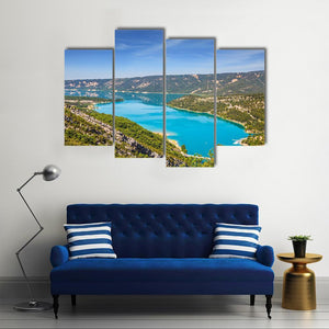 Canyon of Verdon Canvas Wall Art captures a high-angle landscape of clear blue water framed by rocky hillsides, trees, and distant mountains. The realistic, naturalistic scene feels serene and picturesque, with vibrant blues and greens that evoke a calm, nature-focused mood. It fits well in home living rooms or nature-themed spaces that need a peaceful focal point.