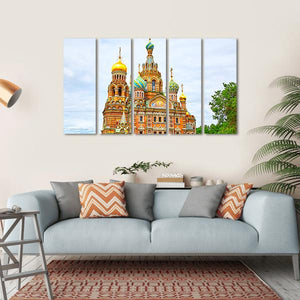 This vibrant canvas wall art features the historic Church of the Savior on Spilled Blood. With its ornate domes and intricate facade set against a blue sky dappled with clouds, this piece adds a touch of architectural elegance to any space.