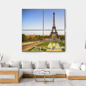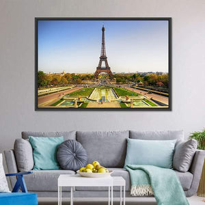 This striking canvas art captures the iconic Eiffel Tower set against a backdrop of fountains, gardens, and trees under a peaceful blue sky. The photorealistic style invites you to experience the grandeur of Paris from an elevated perspective, making it a perfect addition to any decor.