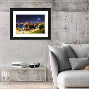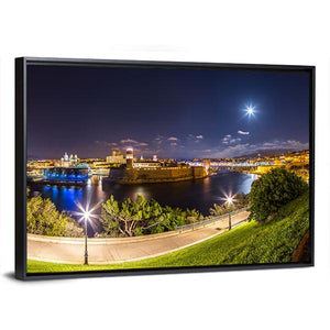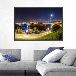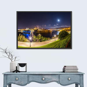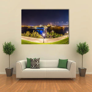This photorealistic canvas art captures the captivating skyline of Marseille's Port of Vieux during nighttime. With its stunning blue, yellow, and green palette, it features illuminated buildings and trees along a tranquil waterfront, creating a serene atmosphere for your decor.