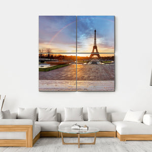 This vibrant canvas art captures the iconic Eiffel Tower beneath a glorious double rainbow. With warm sunset light and a serene fountain nearby, it evokes a romantic atmosphere, making it a perfect addition to your wall decor.