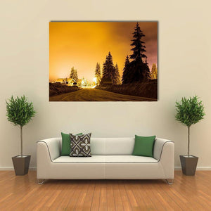 A realistic night scene of a snowy road and pine trees lit by street lights, with a house placed along the road and depth formed by leading lines. Its serene, wintery atmosphere and warm orange-yellow streetlight tones fit modern living rooms, hallways, or bedrooms.