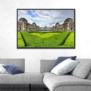 The Louvre Museum Paris Canvas Wall Art puts the glass pyramid and formal gardens front and center in a wide-angle, symmetrical view. Sunlit greens, blues and tan tones give the scene a grand, serene daytime mood that suits modern living rooms and entryways. Geometric hedges and leading lines guide the eye through the composition.