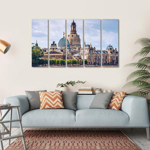 This canvas wall art captures the grandeur of Dresden, showcasing its historical buildings, domes, and statues. The rich palette of blue, brown, and gold evokes a majestic atmosphere, while trees lining the waterfront add a serene touch.