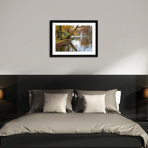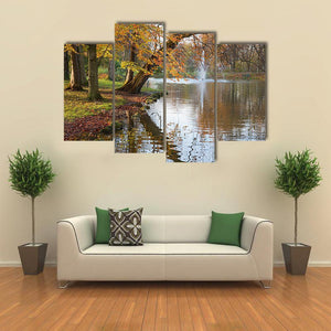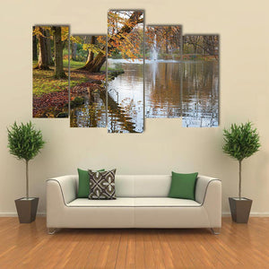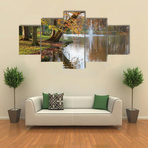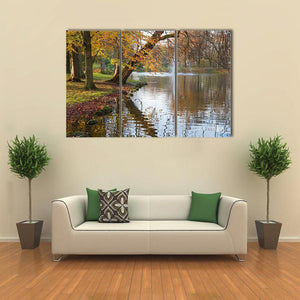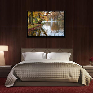 Beech Trees Near Pond Canvas presents a realistic autumn landscape of beech trees beside a reflective pond with water spraying from a fountain. Warm gold, green, brown and blue tones, with fallen leaves on the ground and in the water, create a peaceful, serene mood. Works well in modern or nature-inspired living rooms, studies, or entryways.
