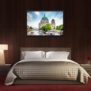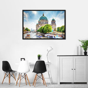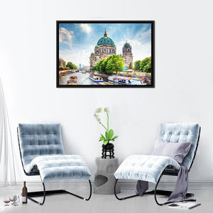 This canvas depicts the Berlin Cathedral and its riverside scene with dome, architectural details, passenger boats and riverside trees rendered in realistic blues, greens, browns and white. The image has a scenic, serene, historic mood that fits well in modern living rooms, hallways, or offices.