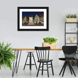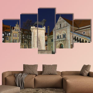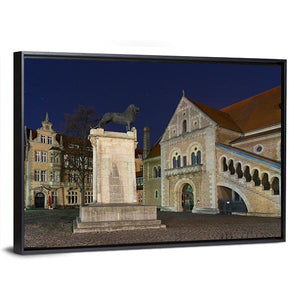 Braunschweig At Night centers on a bronze lion statue in a historic plaza, rendered in cool blues and warm streetlight tones. The realistic architectural cityscape shows surrounding buildings and gentle city lights, creating a calm, historic urban night mood suited to modern living spaces and urban décor.