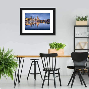 This canvas art beautifully captures the serene charm of a riverfront skyline in Germany, featuring historic buildings and a graceful bridge. The tranquil palette of blue, gold, gray, and white highlights reflections on calm water and the warm glow of city lights.