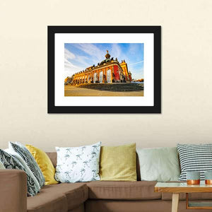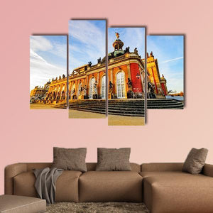 This photorealistic canvas captures Sanssouci Palace in Potsdam, showing the dome-topped statue, arched windows, sculptures and the diagonal steps leading up. The bright, historic scene uses red, gold and clear blue sky with wispy clouds to create a grand architectural mood. It fits well in living rooms, hallways or a study that welcomes classic European landmarks.