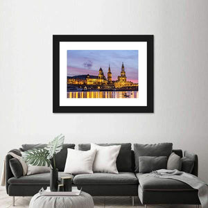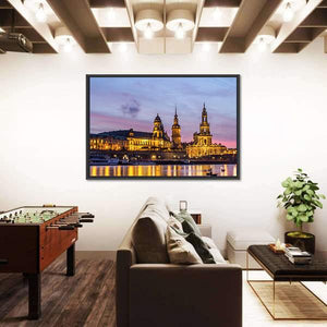 Capture the serene beauty of Dresden with this cityscape canvas wall art. It features a stunning skyline, showcasing ornate historical buildings and gentle boats on the river, all illuminated by the warm hues of a twilight sky.